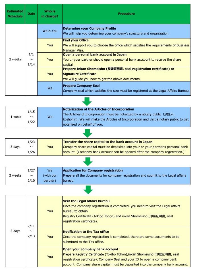In order to register a company, the amount of share capital needs to be deposited into investor’s personal bank account in Japan. In general, you cannot open a bank account in Japan without a long-term Visa and staying more than 6 months since you entered Japan. Therefore, it is necessary to find a partner who can receive the capital in the bank account in Japan.